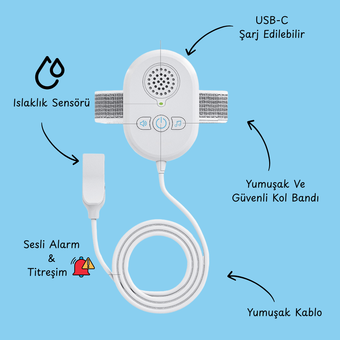 Sensör nemi algıladığında, çocuğunuzu uyandırmak için titreşim ve bip sesi çıkaran alarmı tetikler ve böylece bir kaza meydana gelmeden önce tuvalete gitme ihtiyacını anlamalarına yardımcı olur.